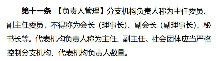 “分支机构负责人称为主任委员、副主任委员,不得称为会长(理事长)、副会长(副理事长)、秘书长等。代表机构负责人称为主任、副主任。社会团体应当严格控制分支机构、代表机构负责人数量。”