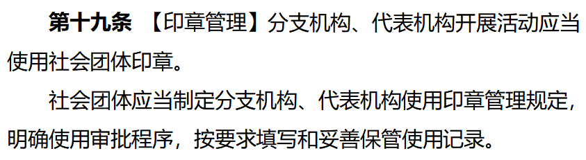 另外,该《办法》(草案征求意见稿)第十九条,还着重强调了印章的使用管理规范,明确:“分支机构、代表机构开展活动应当使用社会团体印章。”